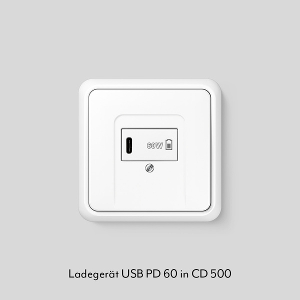 Ab Anfang 2026 sind USB-C-Anschlüsse für alle neuen Geräte Pflicht. JUNG bietet mit dem Ladegerät USB PD 60 eine platzsparende Lösung zum Laden von Akkus mit bis zu 60 Watt mit USB-C Port. Die Ladegeräte sind mit den Serien A, CD und LS kompatibel.